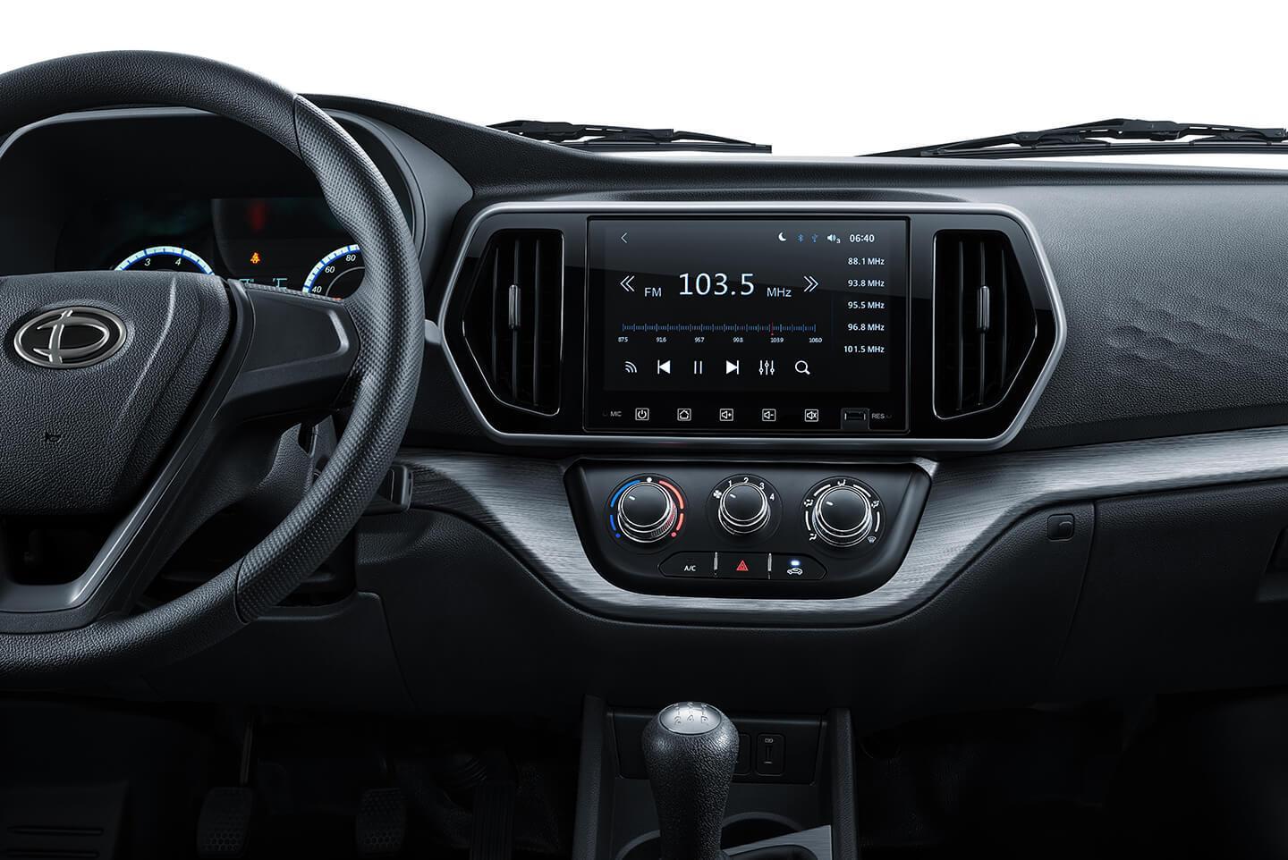 Màn hình giải trí trung tâm 9-inch tích hợp với các tính năng giải trí, được thiết kế liền lạc với taplo, kết hợp camera lùi.